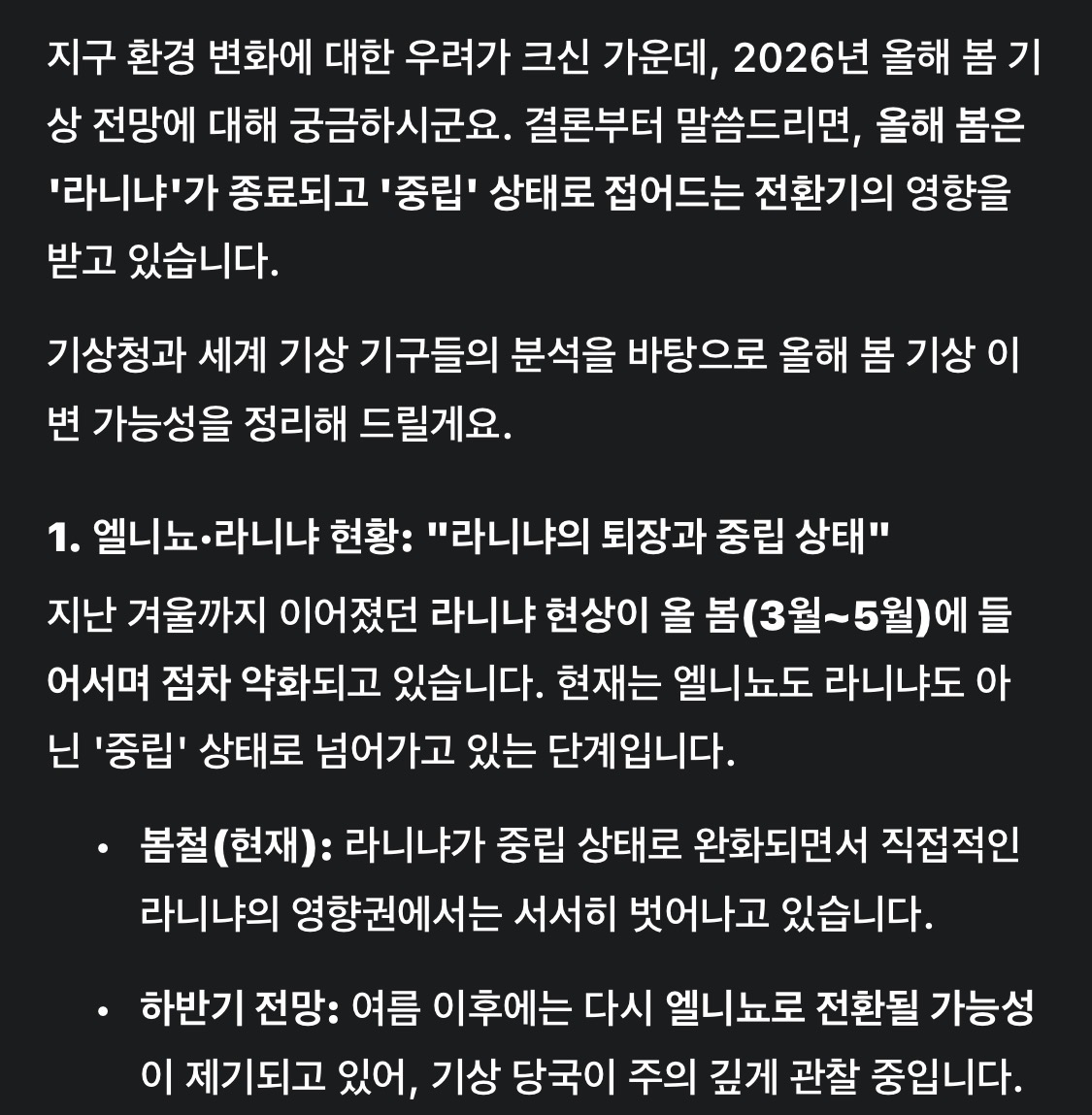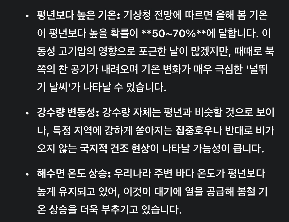 올해 봄은 라니냐가 끝나가는 **'중립 상태'**의 영향을 받지만, 지구 온난화라는 거대한 흐름 때문에 평년보다 더 덥고 날씨 변화가 변화무쌍한 봄이 될 것으로 보입니다.