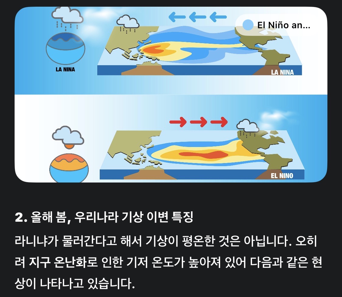 엘니뇨나 라니냐가 뚜렷하게 나타나는 시기가 아니라 중간 단계에 가까운 상태라서, 봄 날씨 변화는 그 영향보다는 전체적인 기온 상승이나 최근 기상 변화 영향이 더 크다고 보는 경우가 많습니다.