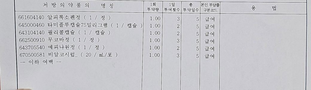 제가 a형 독감으로 사진상의 약들을 처방받았고, 저중에 타미플루캡슐만 셀타플루캡슐로 대체조제 되었습니다.