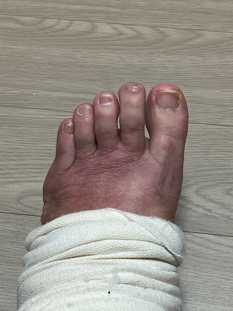 압박붕대나 드레싱 재료에 포함된 접착제나 섬유 성분이 접촉성 피부염을 유발할 수 있습니다. 수술 후 피부가 예민한 상태라 더 쉽게 가려움, 발진, 붉어짐 등의 증상이 생길 수 있습니다. 특히 발등처럼 피부가 얇고 민감한 부위는 더 잘 반응하고 심하면 물집도 생길 수 있어요 증상이 지속되면 드레싱 재료 교체 또 피부과 진료가 필요할 수 있으니 의료진에게 꼭 알리세요!