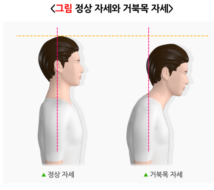 외이도 (귀구멍)과 어깨가 일직선상에 위치하지 않으면 거북목이라고 할 수 있습니다. 목 뒤쪽이 튀어 나온 것은 호르몬 관련 검사를 받는 것이 좋습니다.