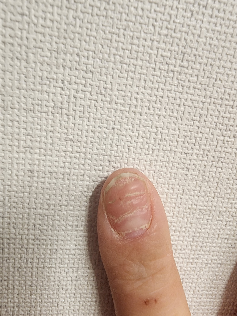 손톱이형성증으로 보입니다. 가까운 피부과에서 진료를 받고 치료받아보실 수 있겠으니 방문해보시기 바랍니다.