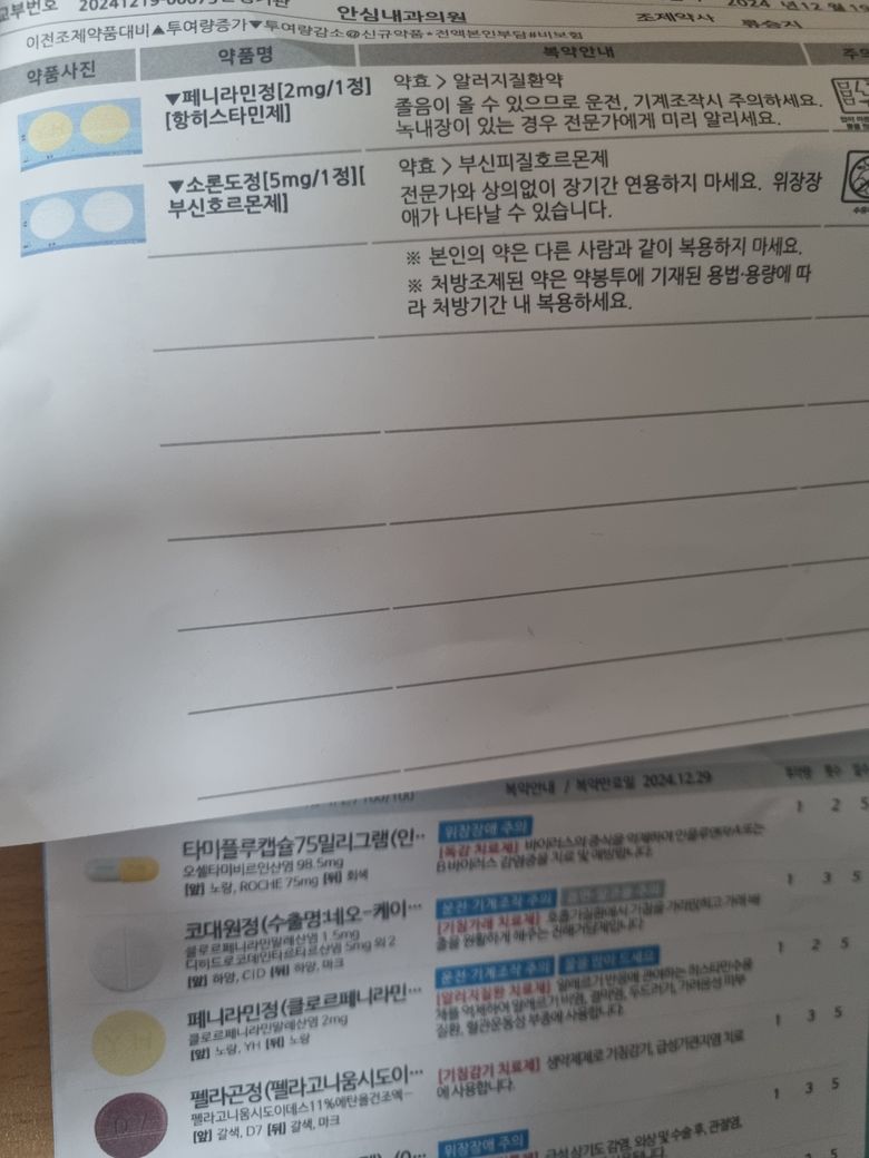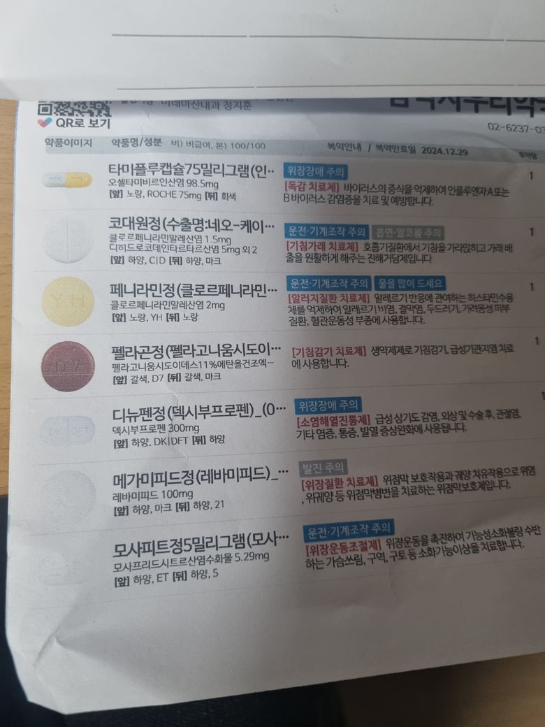문의주신 사진의 약중에 코대원정이 코데인 성분의 마약 성분이 포함되어 있어 검사에 영향을 미칠수 있기에 약봉투 및 처방전을 가지고 가서 해당약을 복용하고 있음을 사전이 이야기하길 권장드립니다.