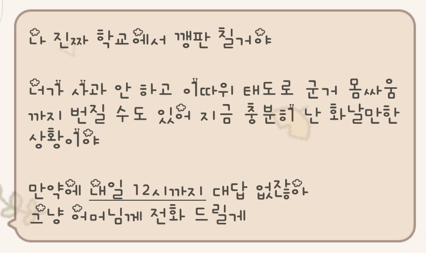 오늘 12시까지 답장이 없으면 저희 엄마에게 전화할거라면서 보이스톡을 새벽 1시에 연속적으로 8번이나 독촉했어요.그러면서 저희가 중학교2학년인데 지금 방학 중이예요. 근데 이 친구가 개학하면 깽판칠거라는둥 몸싸움이 일어날 수도 있다는 중 살인예고 하듯이 싸움(?)예고를 해요. 계속 말 끝에 ㅋㅋ대면서 절 비웃어요.