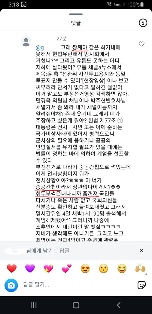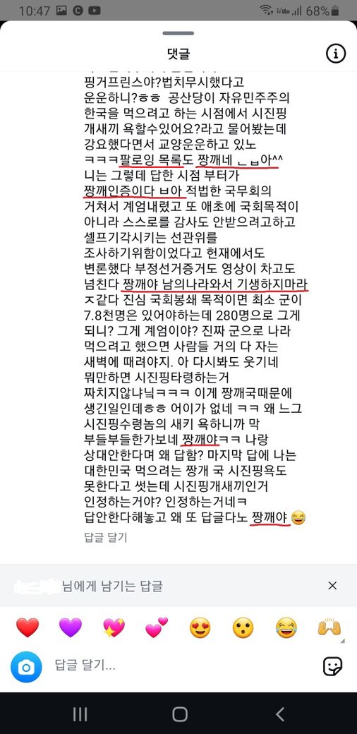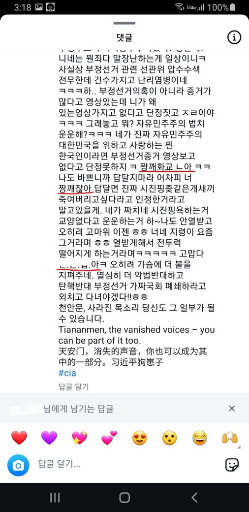 스크린샷에서 보다시피 상대방은 제 프로필을 타고와서 제 실명 및 팔로잉 목록을 확인하였고 프로필 사진도 확인을 하였을 것입니다. 상대방은 저에게 간첩, 짱깨, 남의 나라와서 기생하지마라 취두부 썩은내나니까 좀 꺼져 같은 표현을 하였습니다.