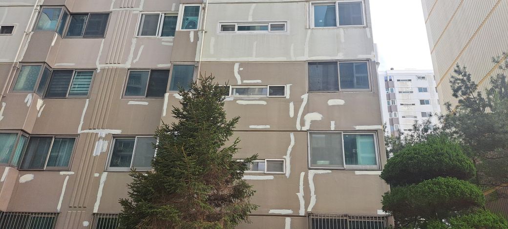여기저기 칠해진 부분은 크랙 보수나 표면 균열을 메우기 위해 실리콘이나 퍼티를 사용해 메꾼 것으로 보여요. 이 작업은 건물의 외벽을 평평하게 만들어 균열이나 틈새로 인한 손상을 방지하고, 페인트를 더 잘 칠해지게 해요