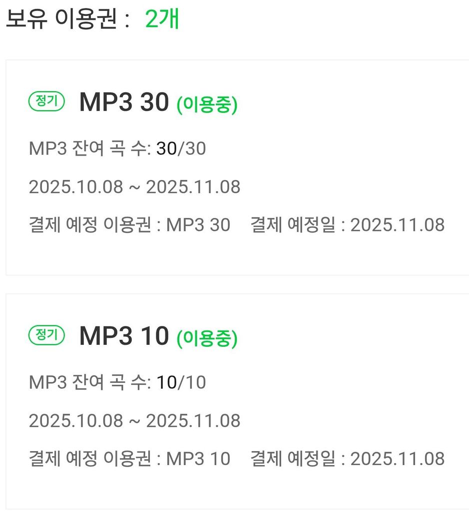 즉, 먼저 결제한 이용권(MP3 10) 이 우선 사용되고, 이후 다음 결제한 MP3 30 이용권이 순차적으로 사용됩니다.