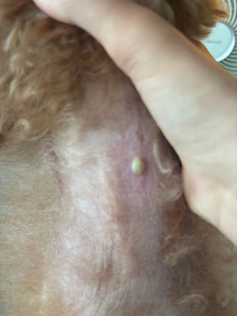 강아지 피부에 초록색깔 여드름 같은게 있는데