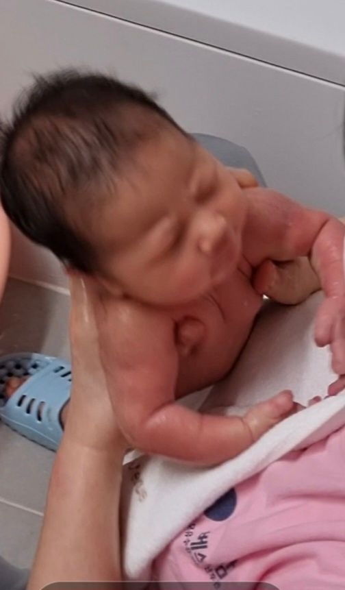 산후도우미께서 아가 목욕후 수건위에 올리실때 목을 못가누는 신생아를 양쪽 겨드랑이에 손을 껴서