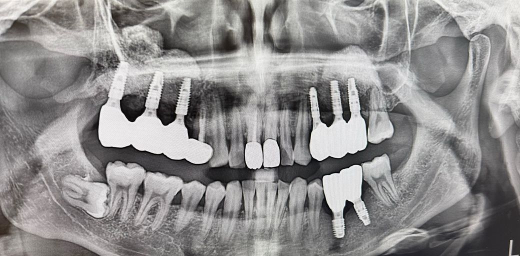 질문으로는 파노라마 사진에서 왼쪽의 상악 보철물의 세번째 잇몸입니다