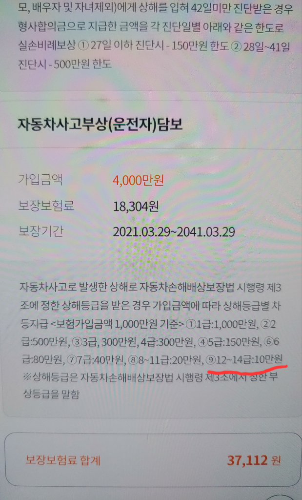 아래 사진에서 12~14급 시 10만원은 보험 가입 금액이 천만원 기준이고 질문자님이 가입한 자동차 사고 부상 담보의 가입 금액은