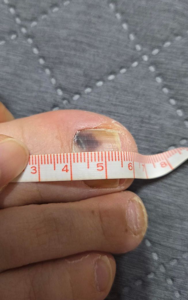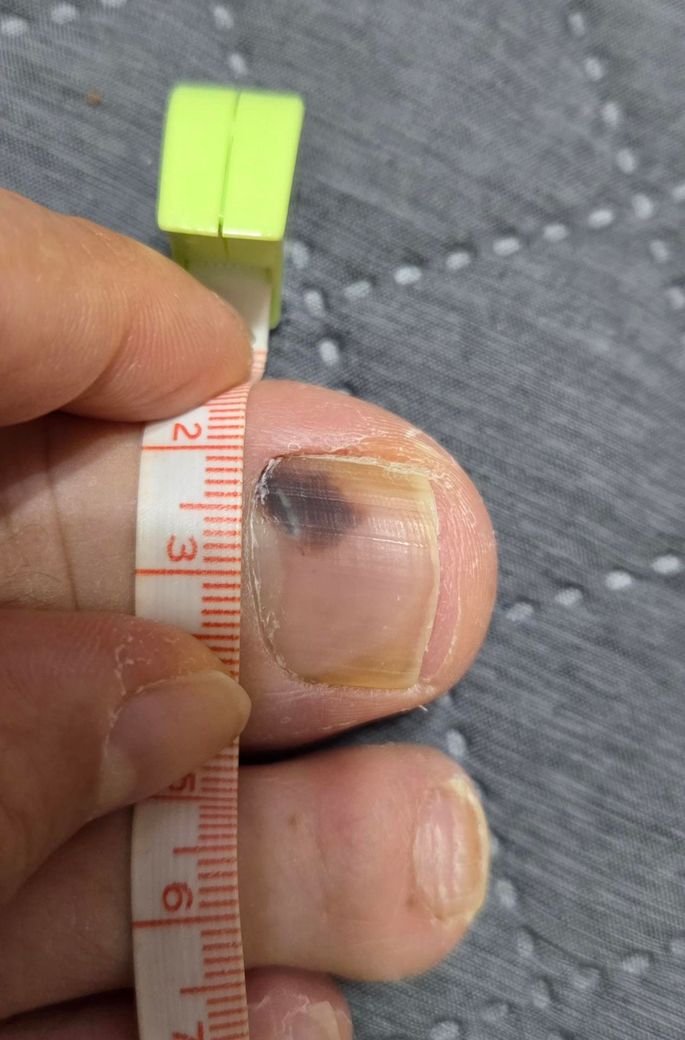 사진상으로는 발톱 아래 국소적인 검붉은 색 변화가 보이며, 형태와 위치를 고려하면 가장 가능성이 높은 것은 조갑하 혈종입니다. 꽉 끼는 신발로 인한 반복적인 미세 압박만으로도 발생할 수 있고, 본인이 외상으로 인지하지 못하는 경우도 흔합니다.