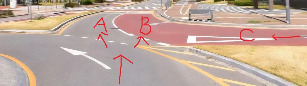 회전 교차로에 빠져나갈 때 C방향에서 B방향으로 우회전 하려고 하는 차량이 먼저인지 입니다.