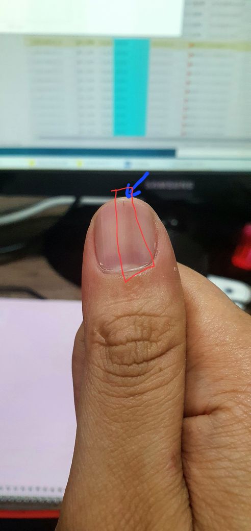 손톱에 보이는 부분은 흑색종은 아니며 손톱이 뿌리에서 자라는 동안에 멜라닌 세포가