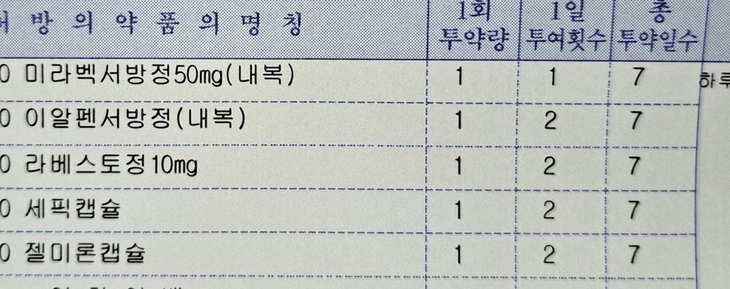 미라벡서방정을 제외하고 처방 받은 다른 의약품들은
