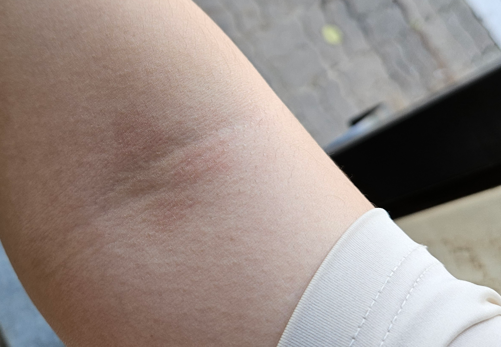 여름철 땀등이 많이 나는 상황이기 때문에 팔꿈치 접히는 쪽에 땀띠 또는 습진 등의 가능성이 높습니다.