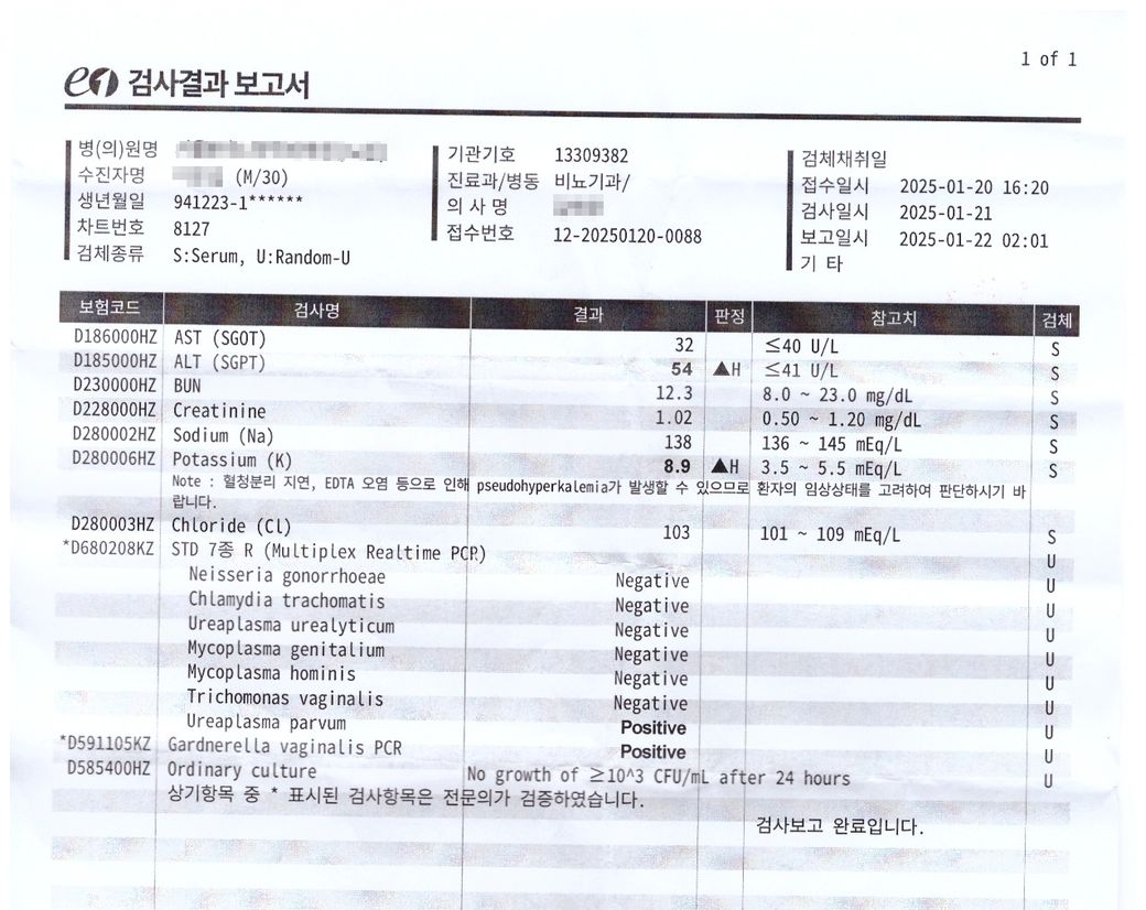 potassium이라고 하는 전해질 수치가 매우 높게 나오셨는데 이건 아마도 혈액을 체취한 바로 검사를 돌리지 못하고 오래 방취되면서 혈액 속 세포들이 파괴되면서 세포 안의 potassium 전해질이 빠져나오면서 생긴 검사의 오류일 가능성이 높아보입니다. 만약 정말로 potassium이 저만큼 높다면 심박동에 영향을 줄 정도로 심각한 수치입니다. tall T 라고 하는 부정맥을 유발하면서 torsade de pointes까지 유발할 수 있는 수치입니다. 그렇기 때문에 이 이상소견도 현재 증상과 연관이 없을 가능성이 높아보입니다.