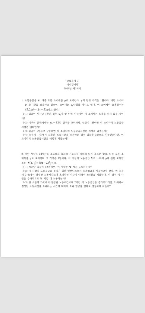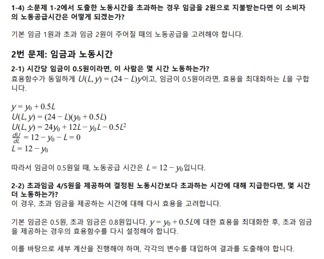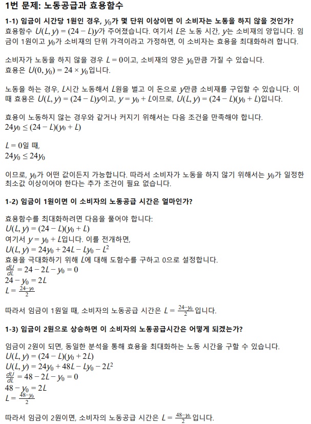 미시경제학 문제들 관련 답변입니다. 답변을 로그 등을 사용하여 하는 것이 어렵기 때문에 그림 파일로 2개로 나눠서 붙였습니다. 건승하시기 바랍니다.