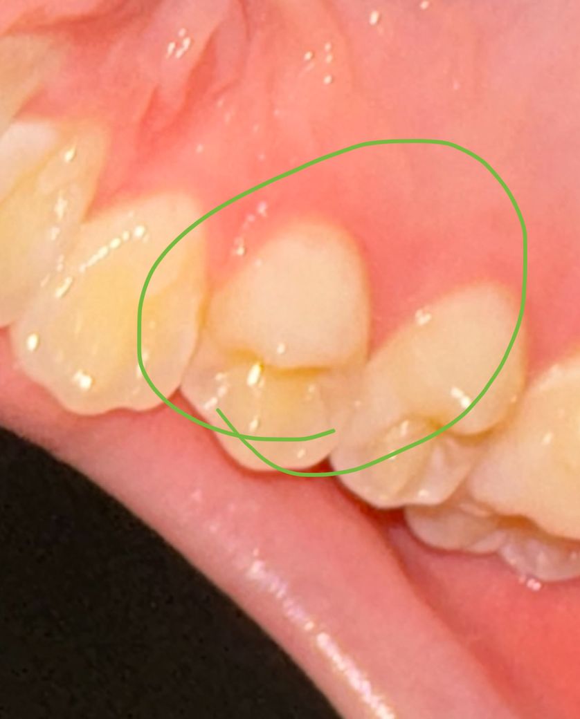잇몸에 염증이 있는 초기 단계로 보이며, 우선은 해당부위를 부드러운 칫솔모로 꼼꼼히 양치하여 관리하여 보고, 만약 통증 및 불편감이 지속시에는 치과에 방문하여 검진을 받고 스케일링 치료를 받길 권합니다.