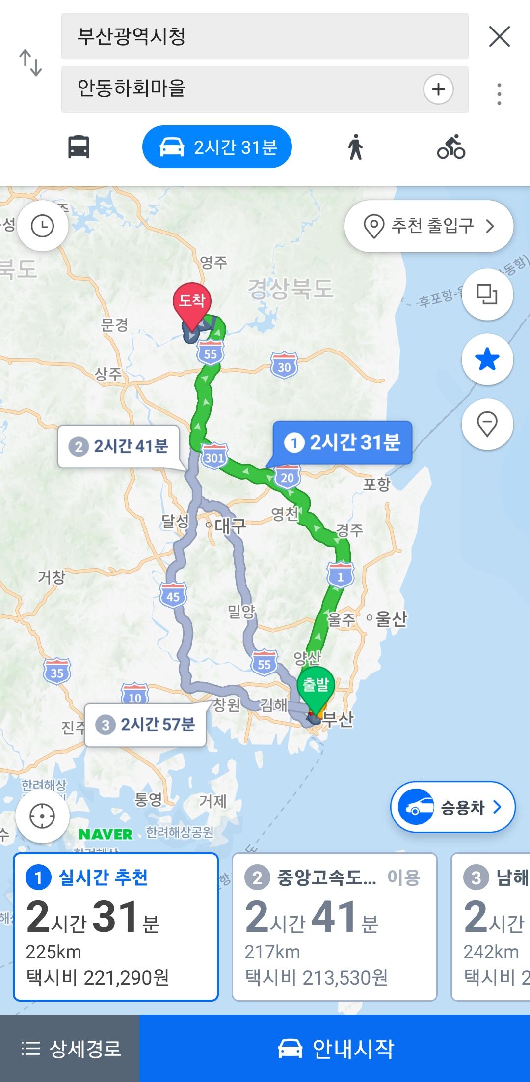 경북 안동시에 있는 하회마을로 여행을 갈려고 하는데요. 부산에서 출발해서 가장 빠른길을 선택해서 가면 시간이 얼마나 걸리는가요?