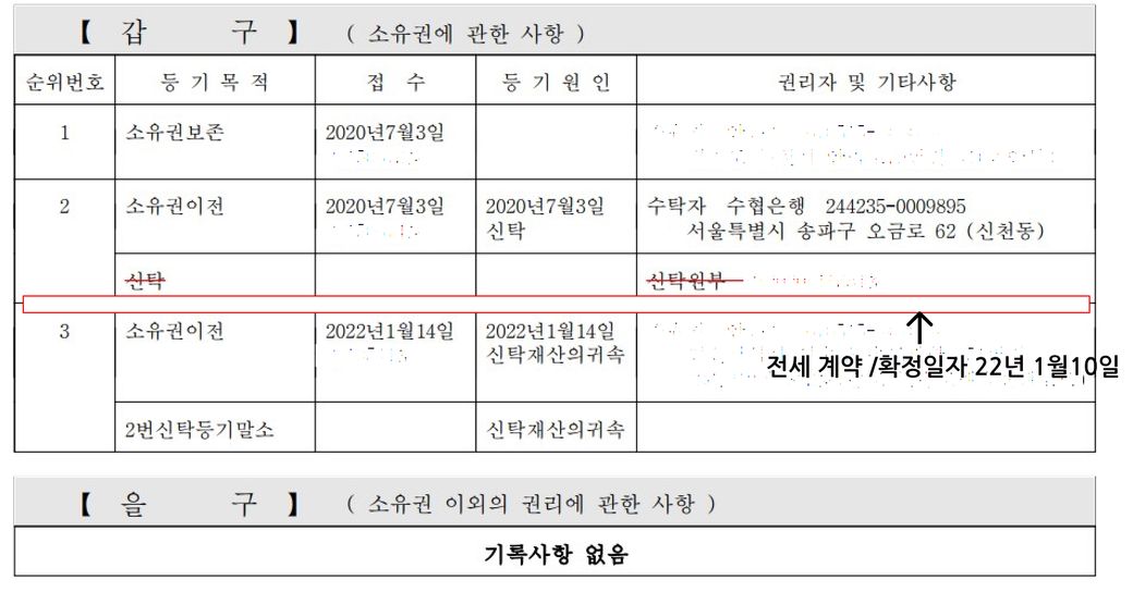 2. 2022년 1월 10일 본인은 집주인과 전세계약을 체결하고 특약사항에 전세계약즉시 신탁말소 조건을 넣었습니다.