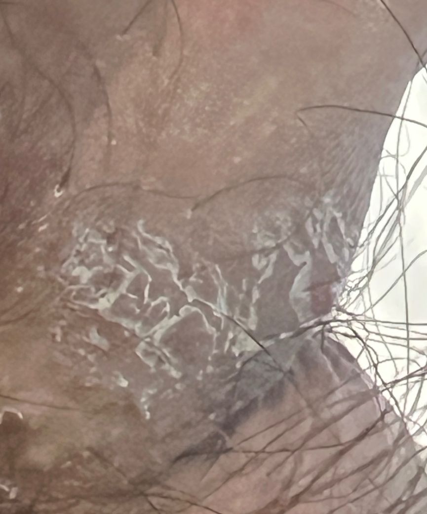 현재 소견을 기준으로 설명드리면, 흰색으로 일어나는 각질, 피부 표면의 균열처럼 보이는 무늬, 뚜렷한 수포나 궤양이 없는 점, 통증 없이 가벼운 가려움만 있는 점은 헤르페스, 매독, 곤지름과 같은 전형적인 성병 소견과는 거리가 있습니다. 특히 헤르페스는 보통 물집이 생긴 뒤 터지면서 통증이 동반되는 궤양 양상으로 진행하는 경우가 많습니다.