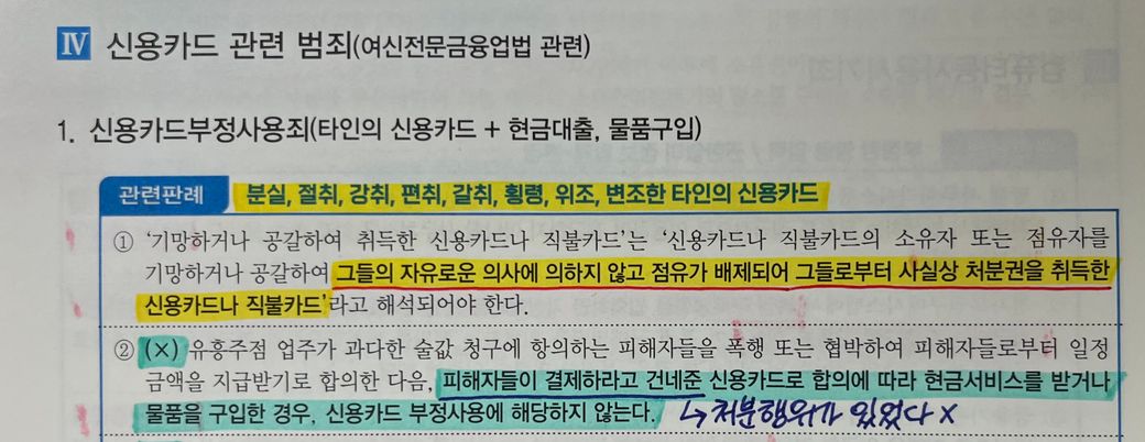 판례에서 [피해자들이 결제하라고 건네준 신용카드로 합의에 따라 현금서비스를 받거나 물품을 구입한 경우 신용카드 부정사용죄에 해당하지 않는다] 는데