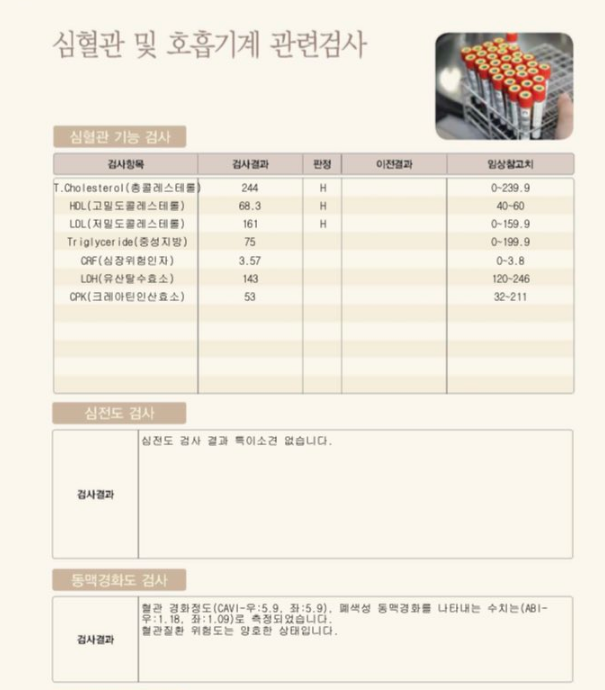 첨부한 사진과 같은 결과지를 받았고, 요약으로 전달해주실 때는 콜레스테롤 수치가 높아졌으니 잘 관리하지 않으면 심근경색 등의 질병이 올 수 있다고 하셨는데