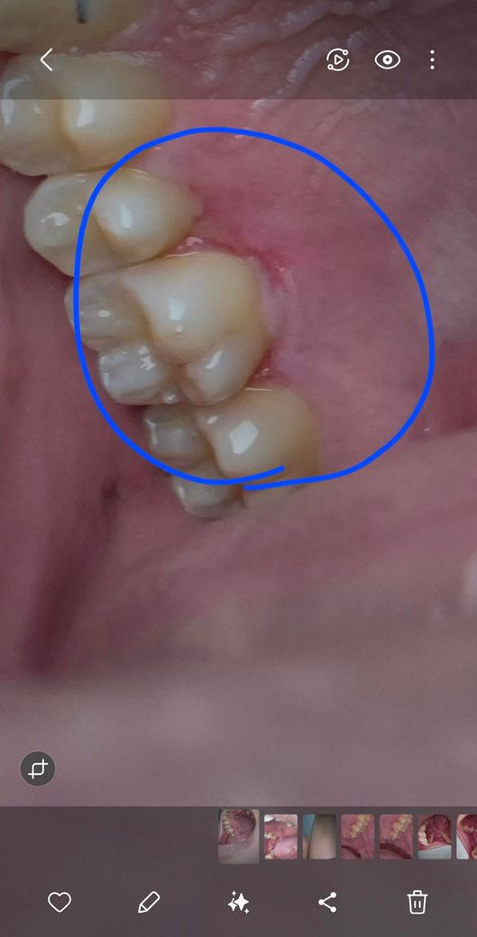안건들면 괜찮은데 밥먹을때나 건드리면 아파요ㅠ 위험한걸까요ㅠ 파란색 동그라미 친부분이고 3~4일정도 된것같아요 궁금합니다ㅠ