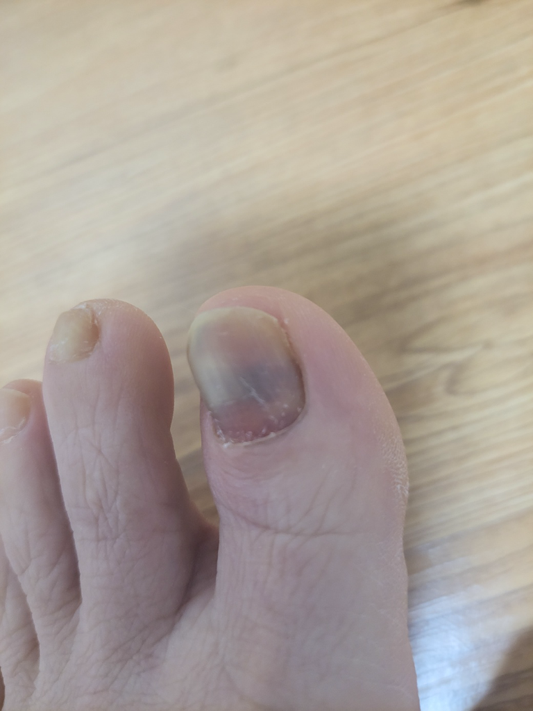 발톱 밑에 출혈이 생겨서 약간 검은색 빛을 띄는 겁니다. 주로 외상에 의해서 생기는데 이상하네요. 일단 냉찜질을 해주시고 소염진통제를 드시지요. 그래도 아프다면 피부과나 정형외과에 가서 피를 빼 내야 합니다.