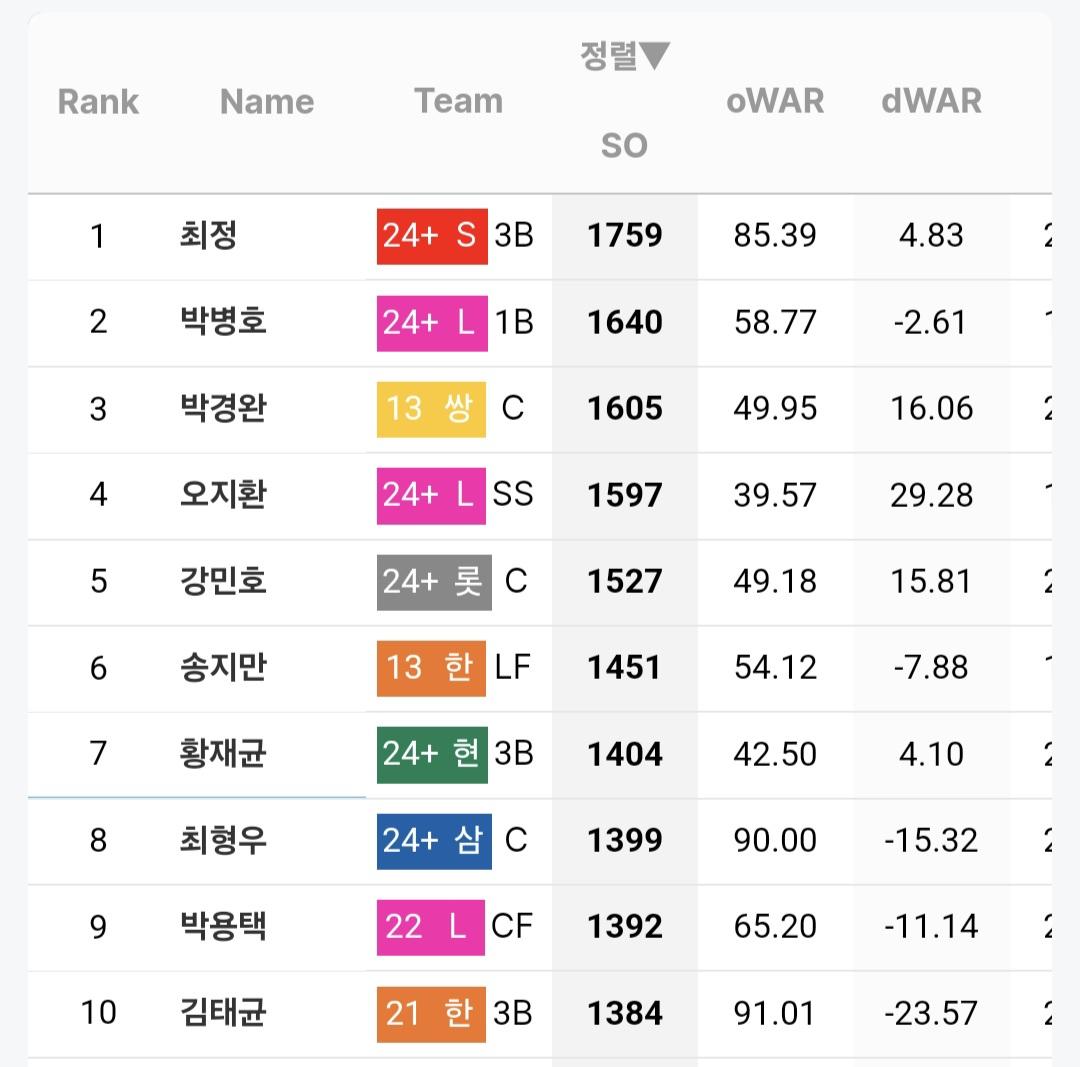 기록을 찾아보니 현재 삼진 최대 보유자는 SSG 랜더스의 최정선수로 1658개를 기록하고 있다고 하네요. 그뒤를 삼성라이온즈 박병호 선수가 1532 개구요