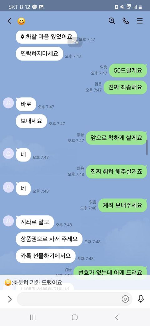 처음에 궁금해서 물어봤다가 잠깐일이 있어서 문자를 못봤는데 갑자기 경찰청 사건 접수 했다고 문자를 보여주면서 협박을 하고 금전을 요구 합니다 금전도 계좌로 보내달라고 하는게 아닌 카카오톡 선물로 보내달라 하는데 진짜 처벌 받나요?