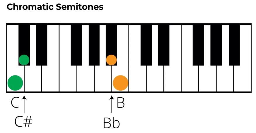 흰건반과 바로 옆의 검은 건반 사이(C-C#)이 반음계적 반음이고