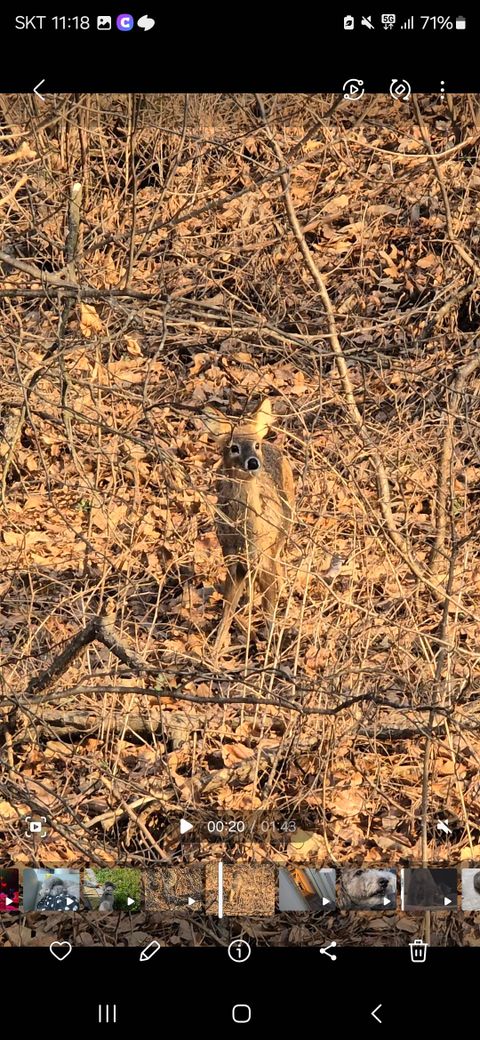 야산에서 우연찮게 찍은 친군데요. 고라니인지 사슴인지 뭔지 모르겠어서 여쭤봅니다. 고라니라기엔 이빨도 없어서 종류가 뭔지 알려주시면 감사하겠습니다