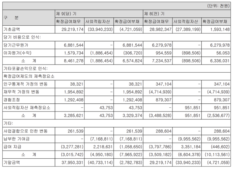 2. 주석 상 확정급여부채와 재무상태표 상 확정급여부채 값이 다른 이유를 모르겠습니다