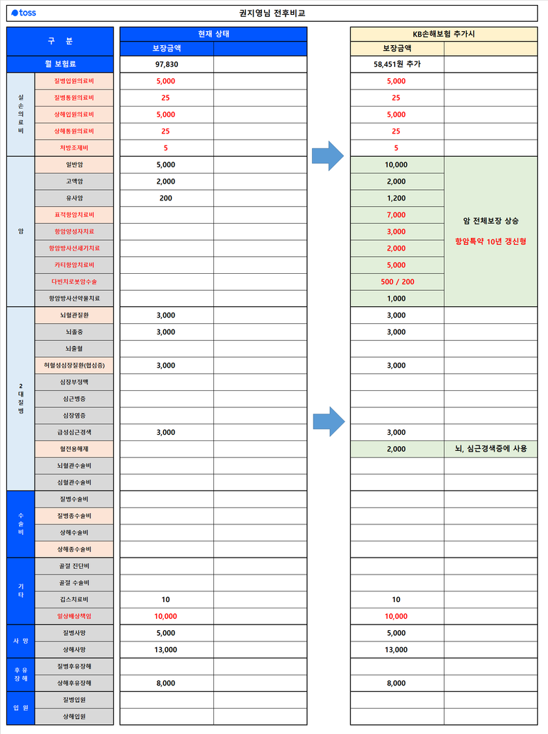 이 보험을 추가했을때 보장금액이 아래와같이 변동이 됩니다.