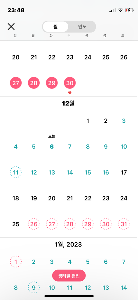 다음 생리 예정일은 12/26이고 배란 예정일은 12/12 정도입니다.