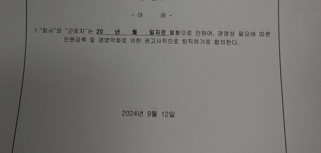 권고사직이라고 하면서 사유에 자진퇴사 또는 근로자 귀책에 따른 권고사직으로 기재하는 경우가 문제되나, 해당 권고사직서에는 회사의 귀책으로 기재되어 있으므로 내용 자체는 동의만 한다면 문제는 없습니다.