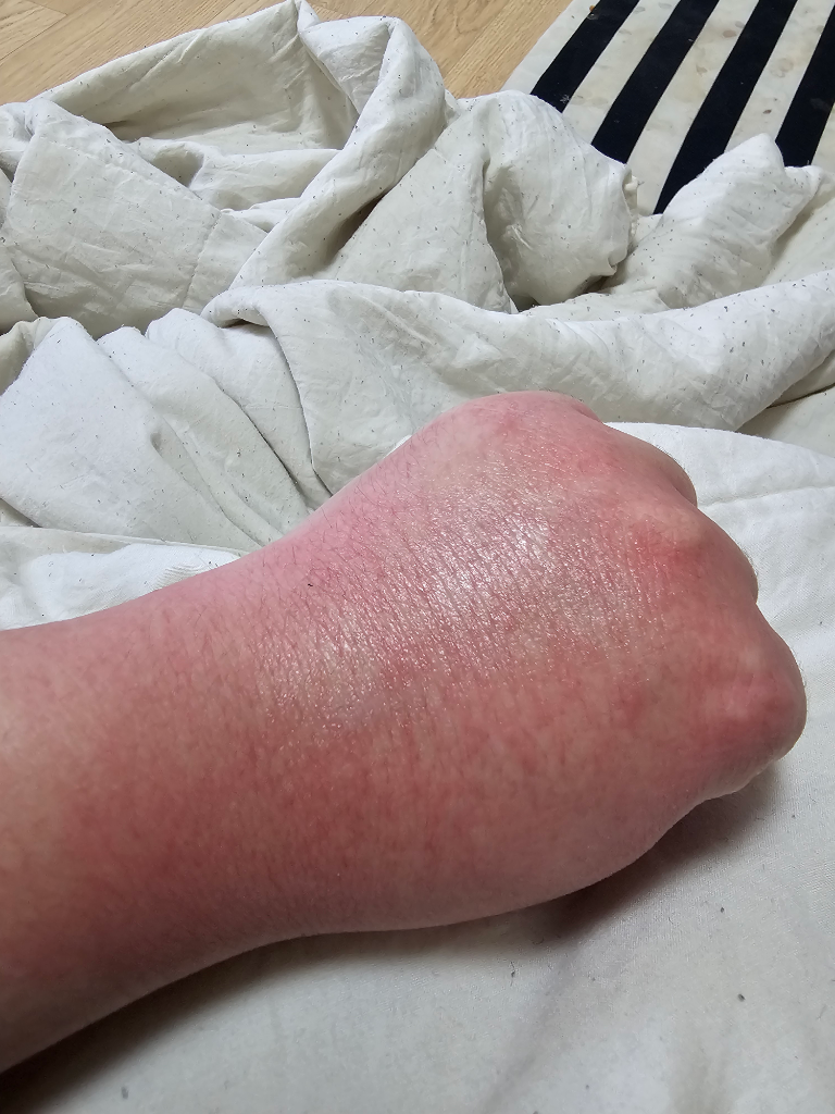 피부과 광범위하게 붉어졌고 따끔거리는 증상까지 동반하고 있습니다. 이러한 피부염에 대해 임의로 조치를 취하기 보다는 피부과를 방문해 진료를 받으시는 것이 안전해보입니다.