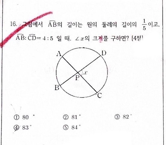 4. 따라서 x = (호 AB + 호 CD) / 2 = (72 + 90) / 2 = 81도.