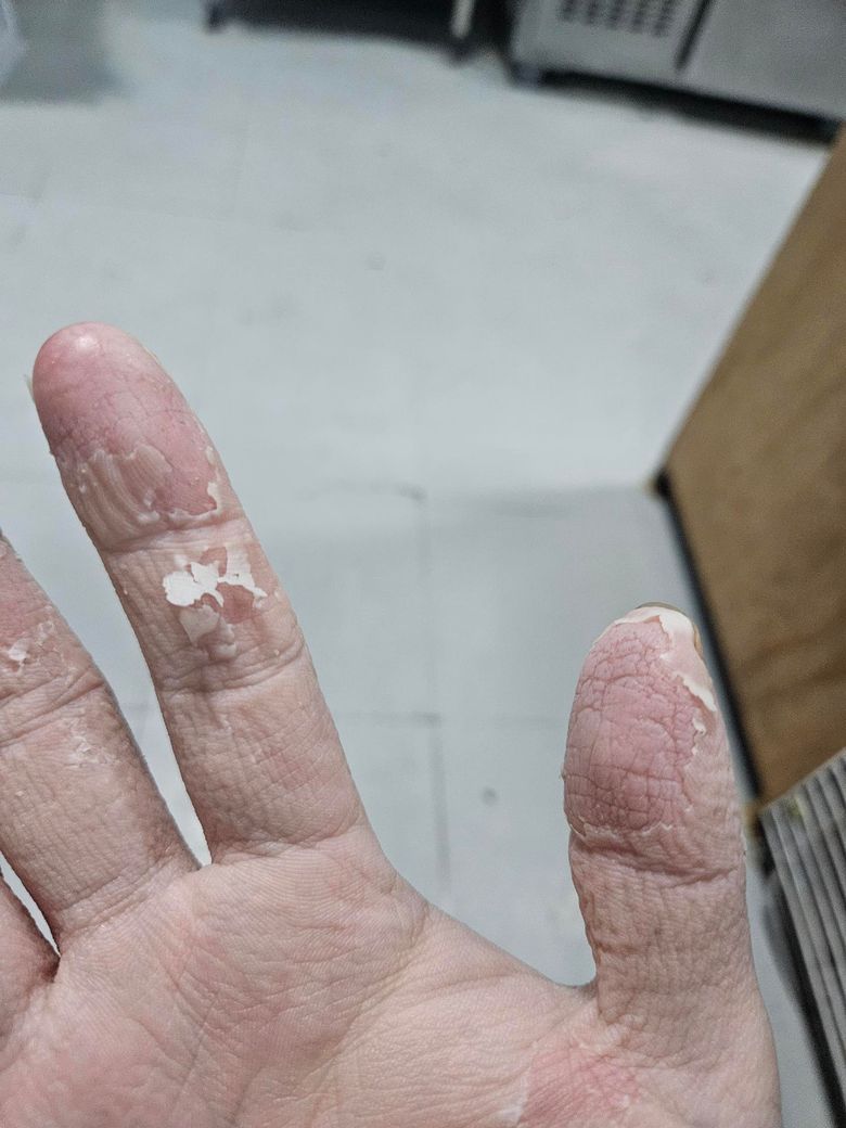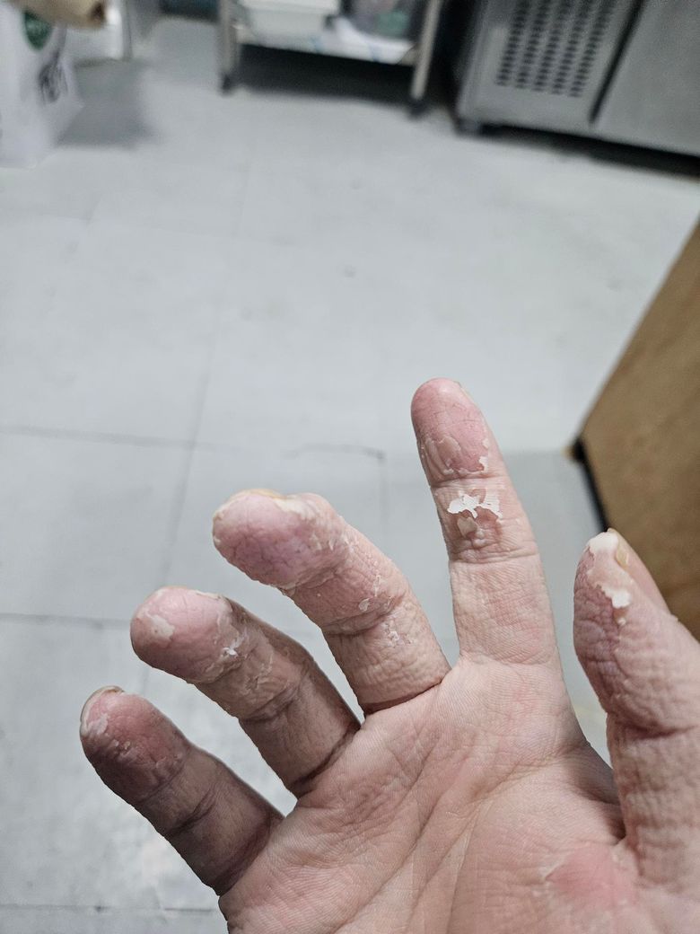 사진 소견상 손가락 끝과 측면에 각질이 벗겨지면서 표피가 얇아진 양상이 보입니다. 주방 업무, 물·세제 반복 노출이라는 병력까지 고려하면 가장 가능성이 높은 것은 자극성 접촉피부염 또는 만성 손습진입니다. 다만 일반적인 습진과 달리 가려움이 거의 없고 “껍질이 벗겨지는 형태”가 주된 경우는 각질탈락형 손바닥염(keratolysis exfoliativa) 가능성도 함께 고려됩니다.