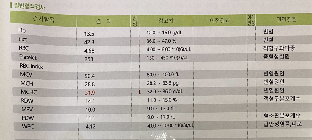 적혈구도 MCHC도 감소되있어서 혈액관련 걱정되는데 어떻게야 하나요?