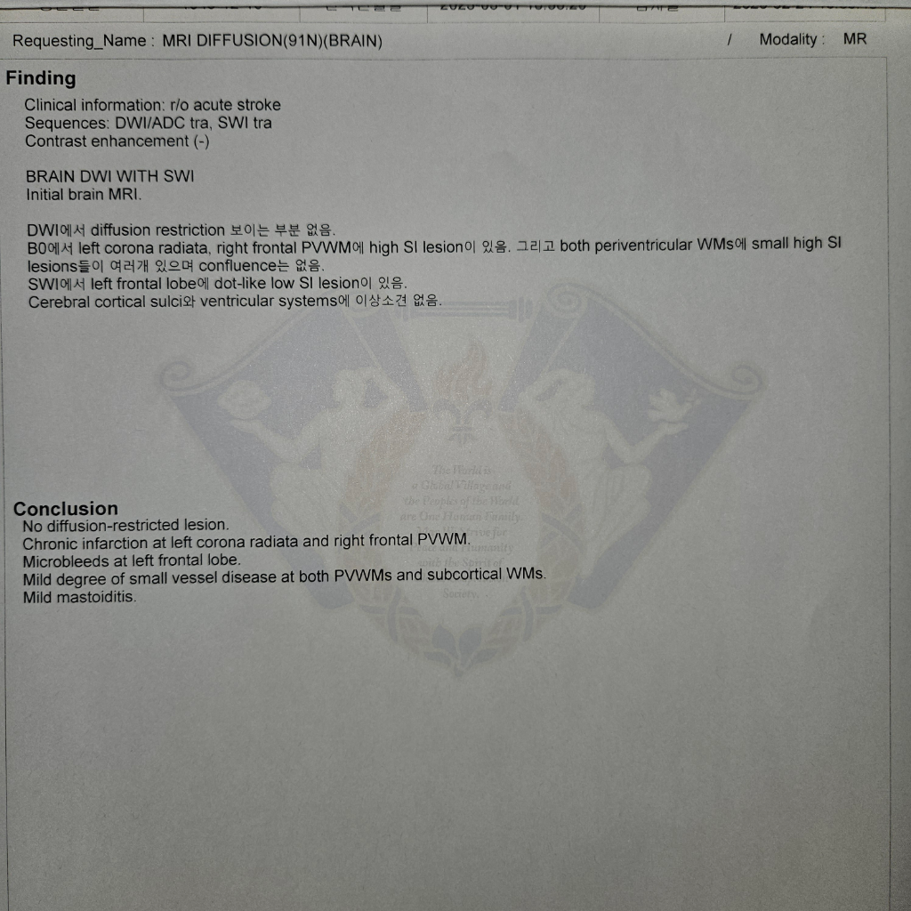 사진에 제시된 뇌 MRI 결과를 기반으로 한 해석은 다음과 같습니다. 결과에는 'No diffusion-restricted lesion'이라는 말이 있어, 급성 뇌졸중의 흔적은 발견되지 않았음을 의미합니다. 'Chronic infarction at left corona radiata and right frontal periventricular white matter(PVWM)'는 과거에 좌측 관상 방사와 우측 전두엽 주변 백질 영역에서 만성적인 뇌경색이 있었다는 것을 나타냅니다. 또한, 'Microbleeds at left frontal lobe'는 왼쪽 전두엽에서 미세출혈이 감지되었다는 것을 말하며, 'Mild degree of small vessel disease at both PVWMs and subcortical WMs'는 두 뇌 반구의 주변 백질과 피질하 백질 영역에서 작은 혈관의 질환이 경미한 정도로 있다는 것을 의미합니다. 'Mild mastoiditis'는 경미한 유골염(귀 뒤쪽의 유골 부위에 발생하는 염증)이 있다는 것을 나타냅니다.
