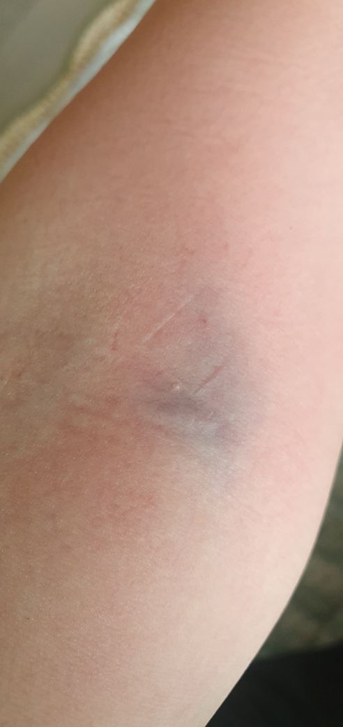 혈관이 약하거나 채혈 후 충분히 지혈하지 않은 경우 혈관에서 혈액이 새어나가 생길 수 있는 증상 입니다.