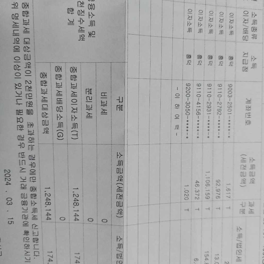 전 금융기관 합산하여 종합과세 대상이 되는지는 본인이 판단하여야 하며, 5월에 종합소득세 신고 안내문을 받거나 국세청 홈택스에서 확인하실 수 있습니다.