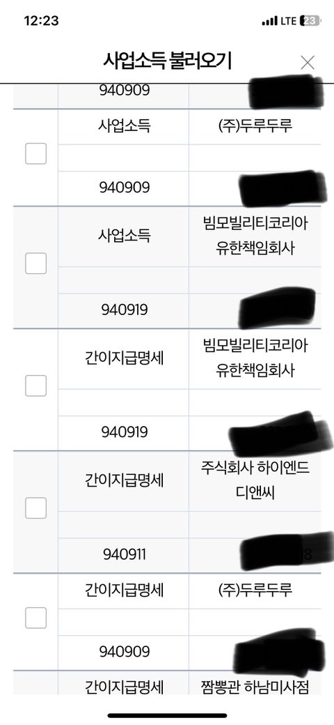 중복으로 하면 안됩니다. 두루두루와 팜모빌리티는 사업소득과 간이지급명세의 금액이 동일 하면 둘 중 하나만 선택하면 되고 하이엔드디앤씨와 짬뽕관은 간이지급명세서만 있으므로 선택 하면 됩니다.