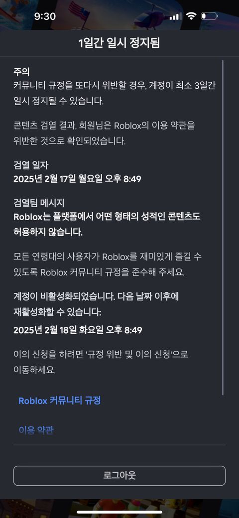 로블록스 1일간 정지 당했는데 풀리면 계정 돌아오겠죠?
