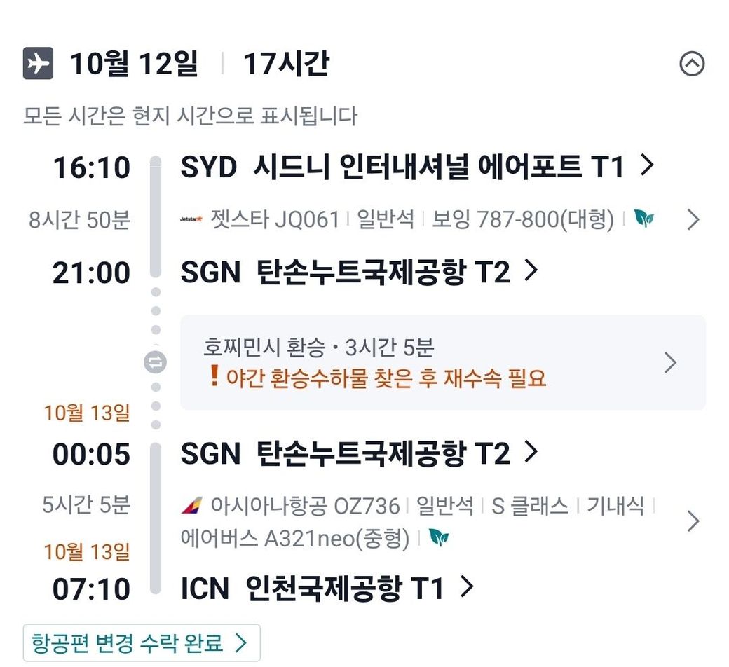 시드네-베트남 경유 후 한국으로 오는 경로인데