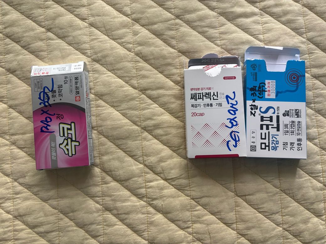 감기가 걸렸는데 코랑 목이 둘다 말썽이네요ㅠ 일단 집에있는 약 먹으려고 하는데 왼쪽 속코정이랑 함께먹어도되는 목감기약 오른쪽 두개 중에 하나 골라주시면 감사드리겠습니다!ㅠㅠ