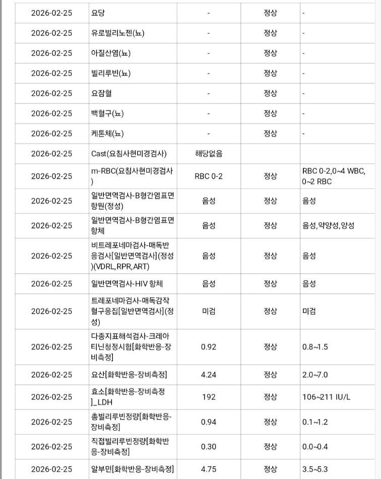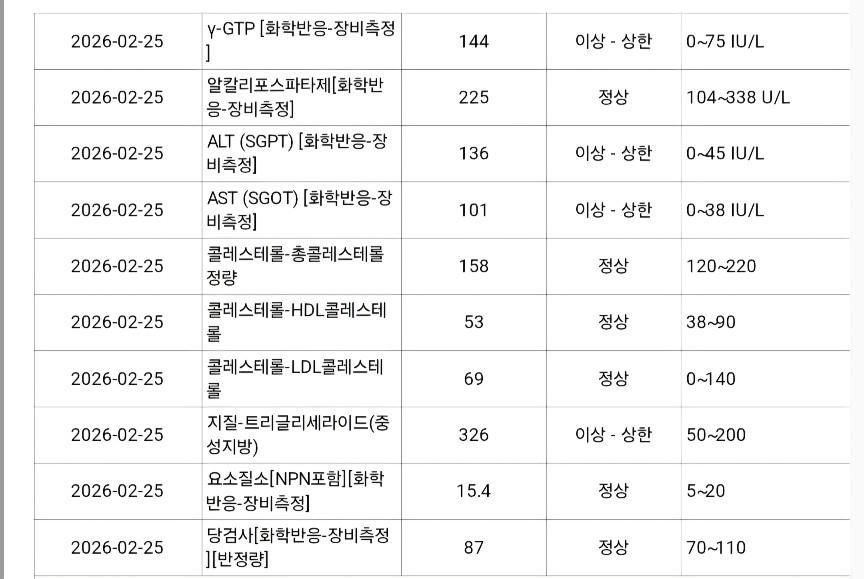 검사 결과를 보면 전반적으로는 안정적입니다. 혈액검사(CBC)는 정상 범위로 빈혈이나 염증 소견 없고, 신장기능(크레아티닌), 당, 요검사도 이상 없습니다. 다만 간수치에서 AST 101, ALT 136, 감마지티피 144로 상승이 확인되고, 중성지방이 326으로 상승되어 있습니다. 이 패턴은 급성 간손상 회복기, 지방간, 약물 영향, 또는 최근 간염성 변화 이후 회복 과정에서 흔히 보입니다. 실제로 이전에 간수치가 크게 상승했던 병력이 있어 연관 가능성이 높습니다.